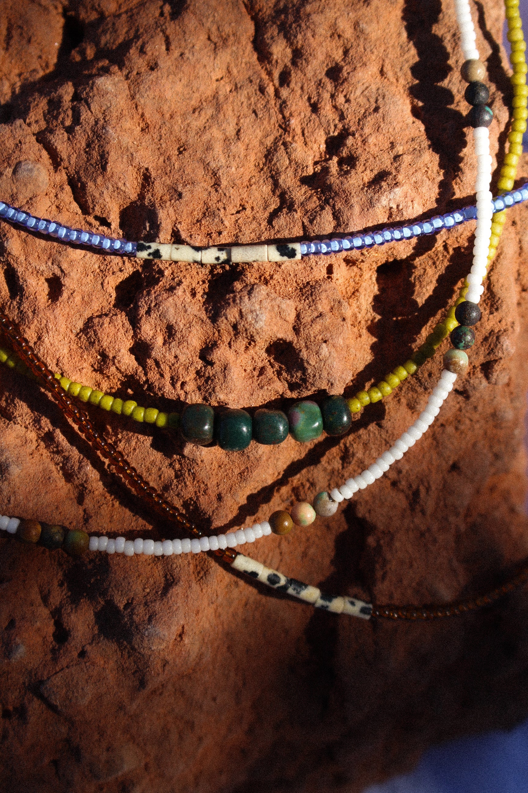 Featuring semi-precious stone African Turquoise with white glass seed beads — an easy, everyday piece with a clean, natural feel.